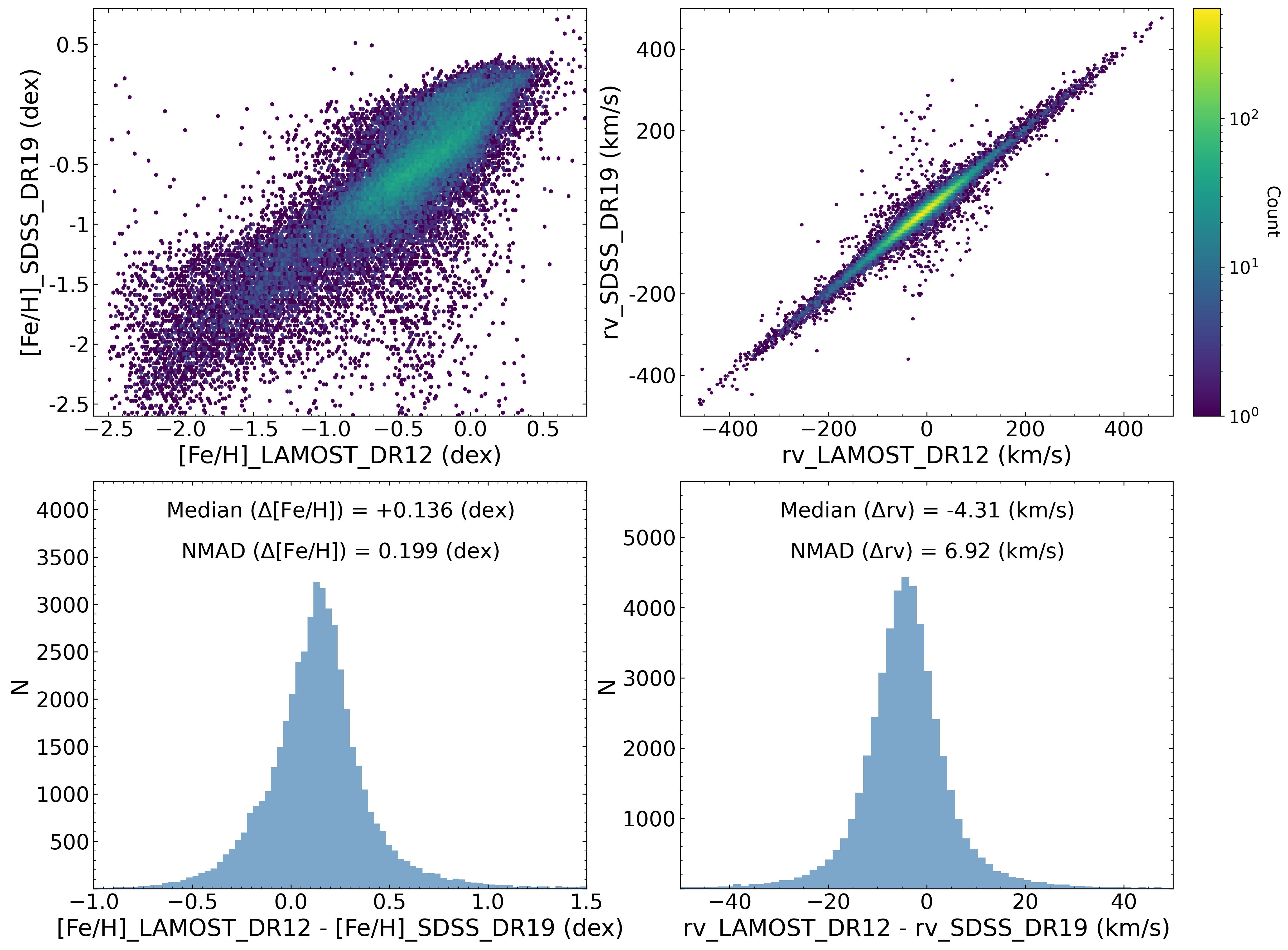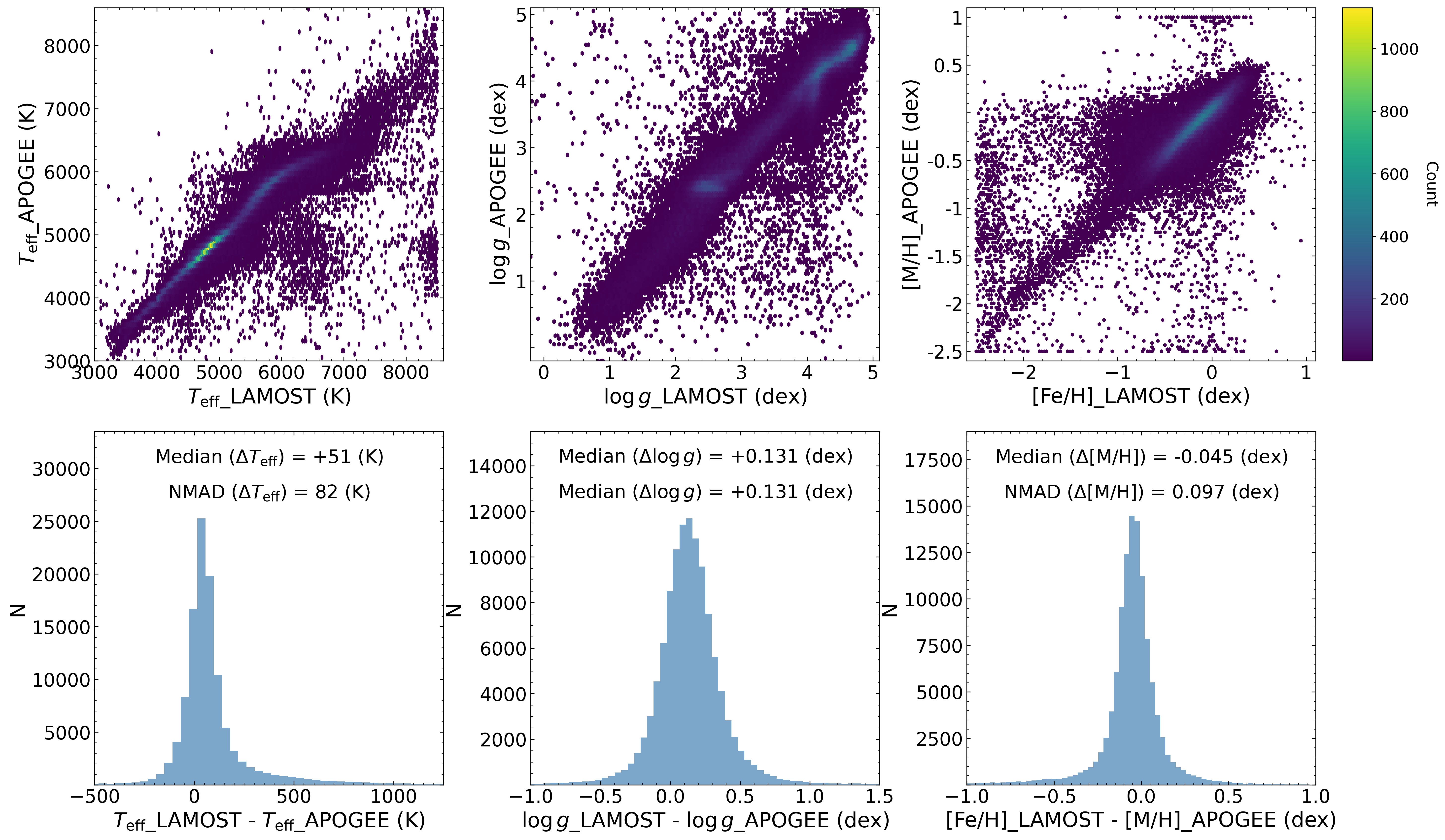 In the following sections, we compare stellar parameters from LAMOST low- and medium-resolution spectra with those from SDSS DR19, APOGEE DR19, and GALAH DR4 to validate the reliability of LAMOST parameters. To provide a comprehensive overview of the LAMOST data, we have not applied any quality cuts to either LAMOST or the comparison survey data, presenting parameter comparisons for all common sources. It should be noted that null values and invalid values (such as -9999) have been filtered out from all parameters, and a very small number of outliers may exist beyond the displayed ranges in the figures. Furthermore, the distributions of parameter differences between LAMOST and other surveys may or may not follow normal distributions. Therefore, instead of using mean and standard deviation to characterize the difference distributions, we employ two more robust statistics applicable to both normal and non-normal distributions: the median of the differences ("median"), which measures systematic offsets between parameters from the two surveys, and the Normalized Median Absolute Deviation ("NMAD"), which quantifies the scatter. These two statistics are annotated on each difference distribution plot presented below.