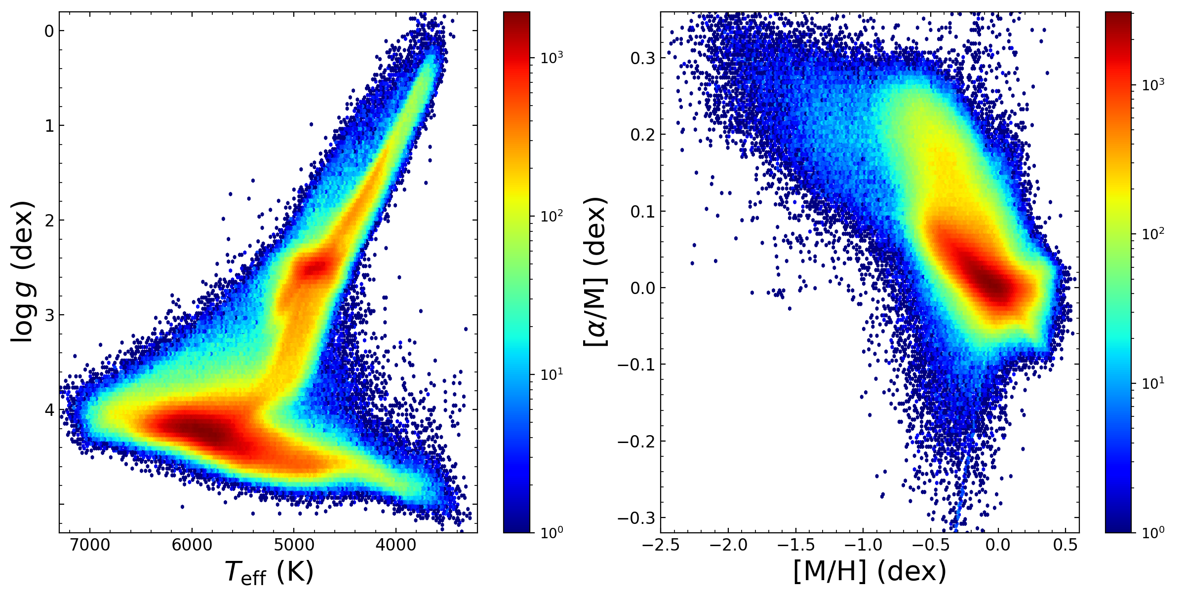 We also provide an additional set of stellar parameters, including Teff, log g, [M/H], and [α/M], derived using a convolutional neural network (CNN) approach. The corresponding Teff–log g diagram and [M/H]–[α/M] diagram for the combined spectra of DR11 v2.0 are presented below.