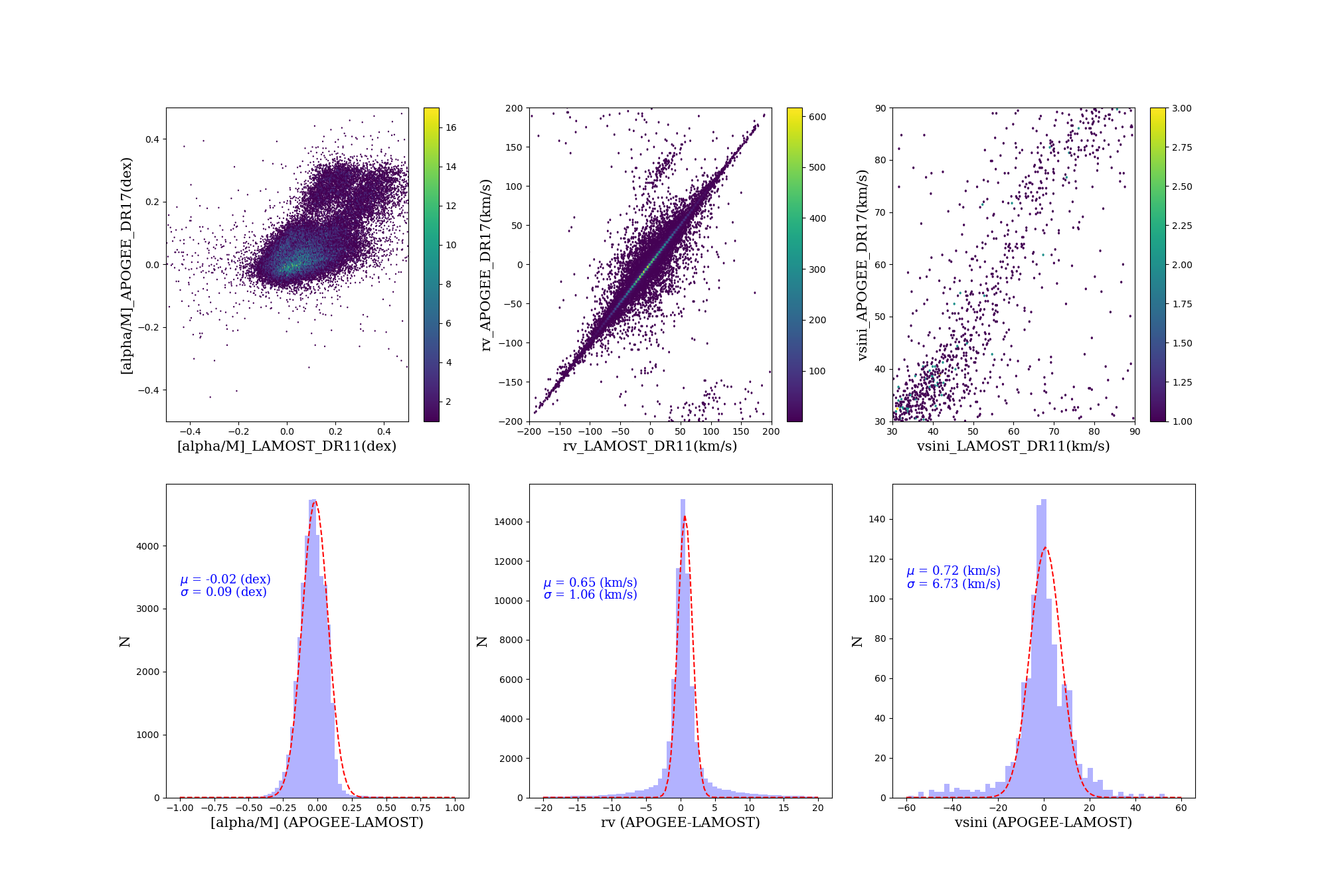 A comparison of atmospherical parameters (Teff, logg, [Fe/H], and [α/M]), rv and vsini determined by LASP and ASPCAP are shown in the following figures. We also plot the mean values and the standard deviations of the differences of the parameters in the figures.