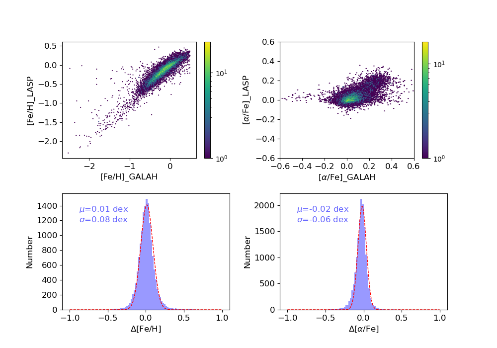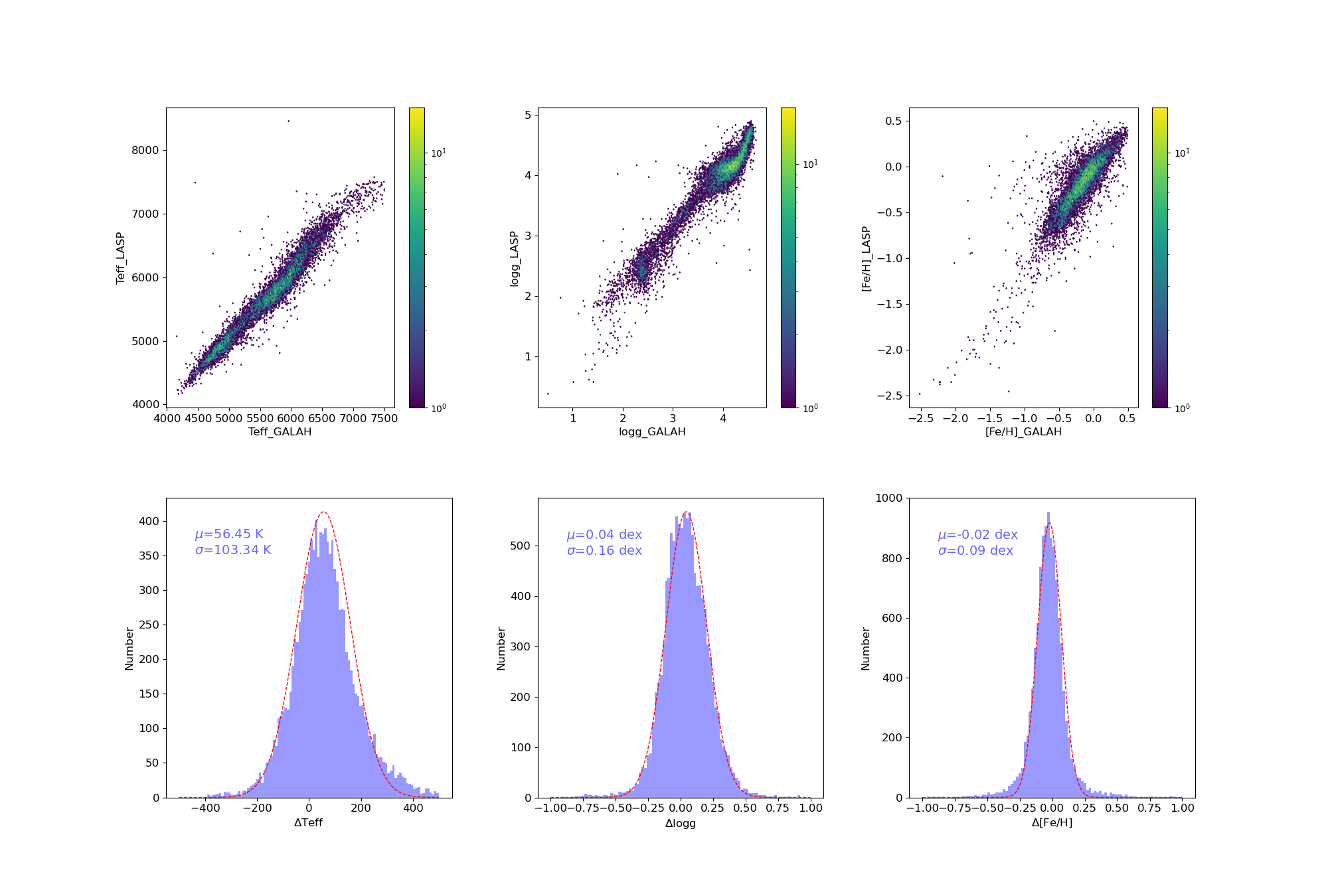 A comparison of atmospherical parameters (Teff, logg, [Fe/H] ) determined by LASP and GALAH DR3 are shown in the following figures. We also plot the mean values and the standard deviations of the differences of the parameters in the figures.