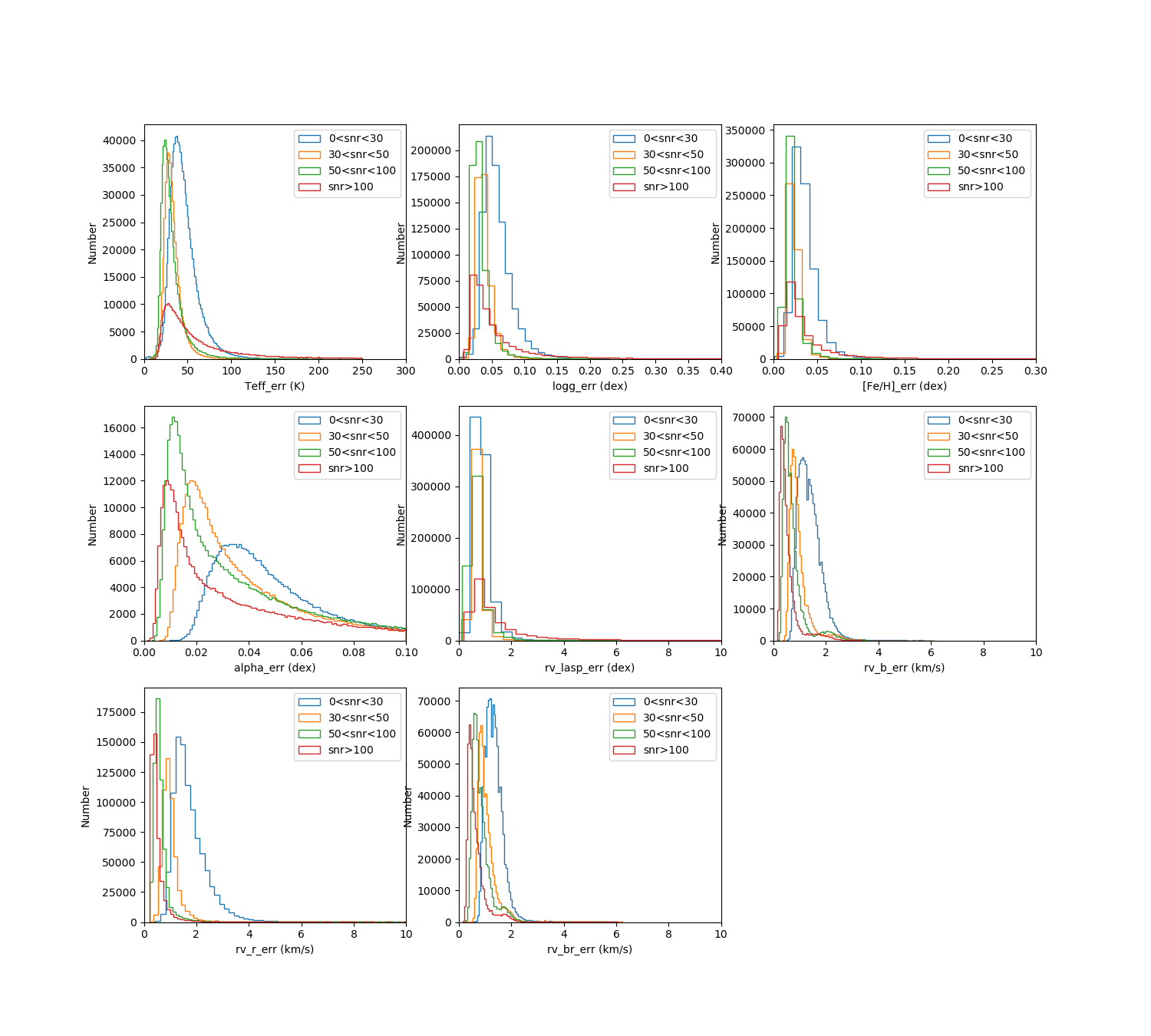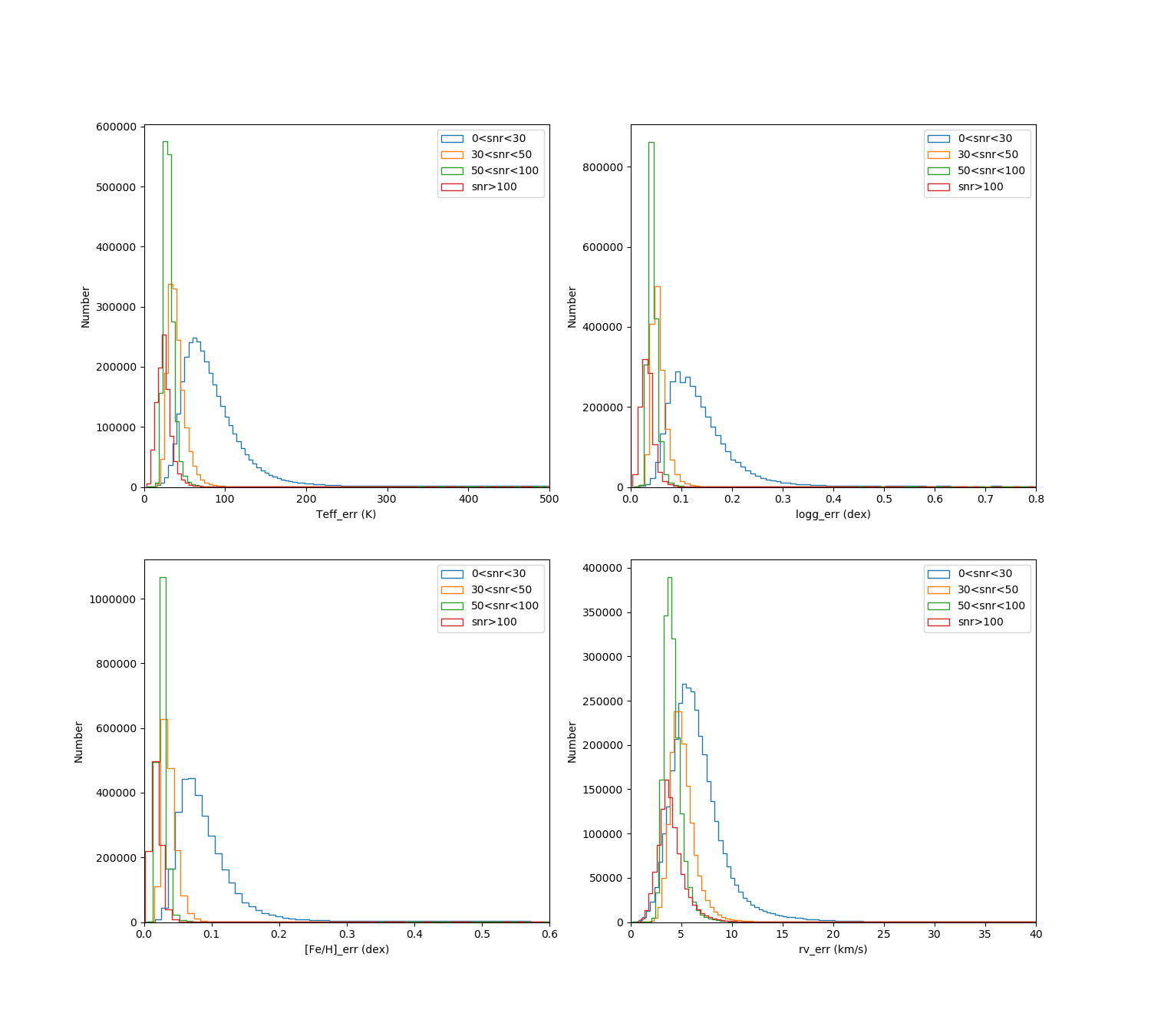 The following diagrams show the distributions of errors of atmospherical parameters (Teff, logg, [Fe/H]) as well as rv in different SNR of r band (snr)) bins. These parameters are estimated by LASP.