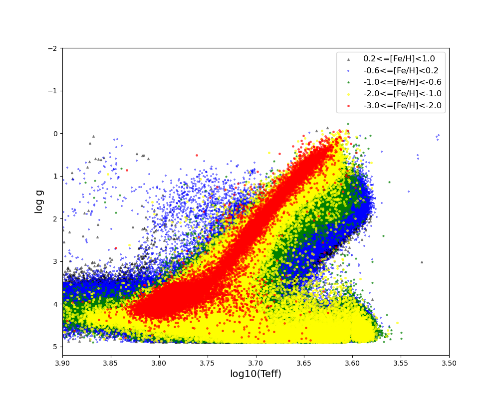 The atmospherical parameter distribution of DR11 v1.1 is shown as follows. Metallicity bins are represented by different colors.