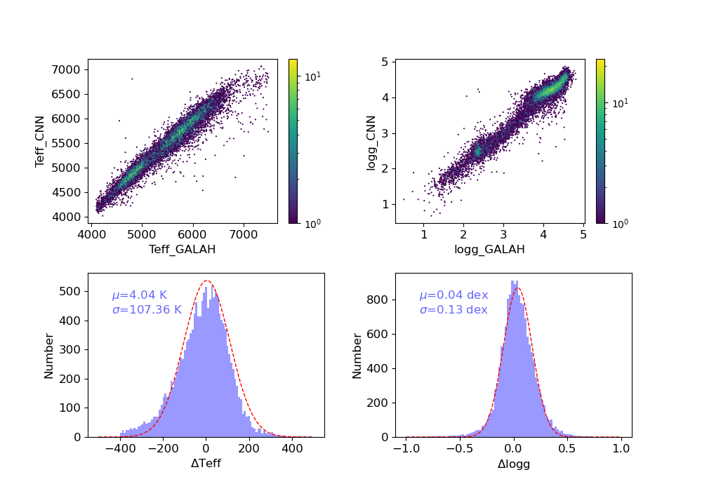 A comparison of atmospherical parameters (Teff, logg, [Fe/H] and [α/Fe]) determined by CNN and GALAH DR3 are shown in the following figures. We also plot the mean values and the standard deviations of the differences of the parameters in the figures.