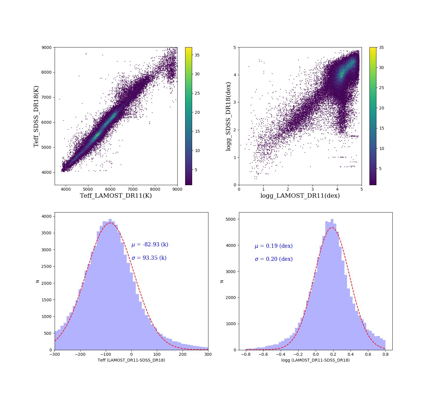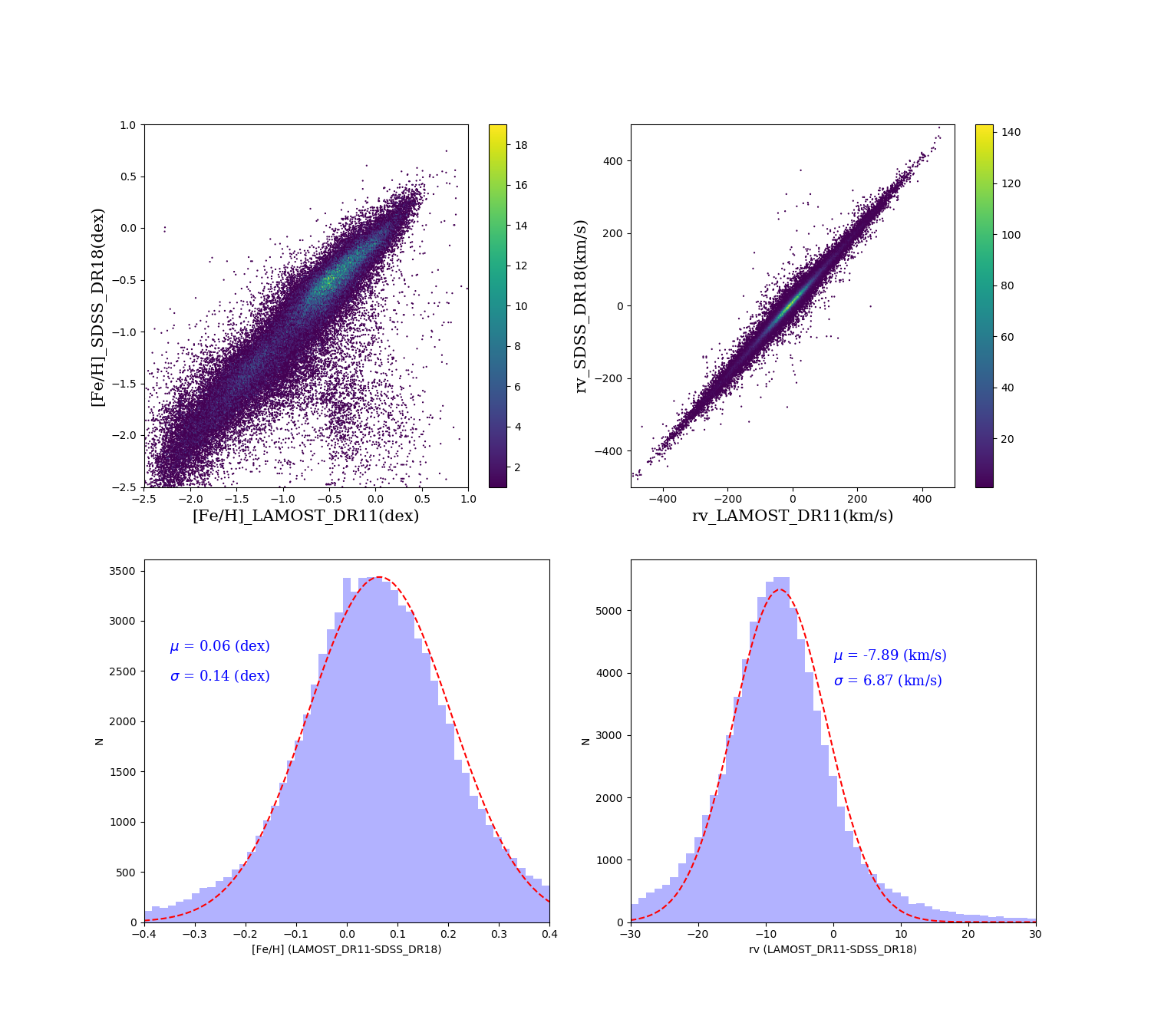 The following figures show the comparisons of atmospherical parameters (Teff, logg, [Fe/H]) as well as rv between DR11 v1.1 low-resolution data and SDSS DR18. The mean values and the standard deviations of the differences are also plotted in the figures. For the parameters of logg, a branch is seen in the top-right panel. It could be explained by the inhomogeneous distribution of the atmospherical parameters in the ELODIE library. There are holes for giants in the ELODIE library, making the estimations of the initial guess for atmospherical parameters in the giant holes inaccurate.