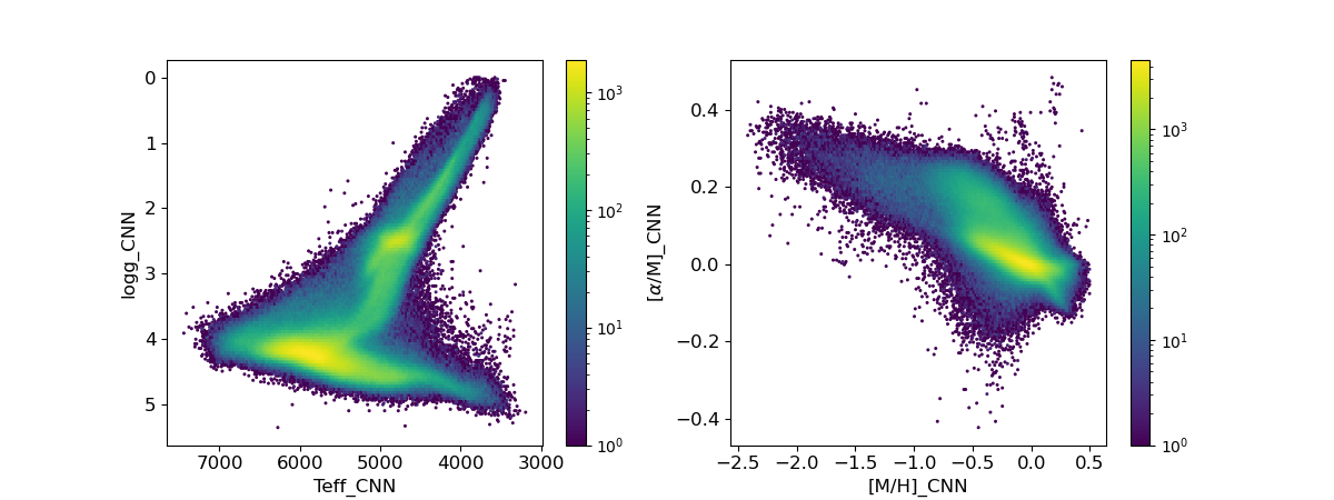 We also provide another set of atmospherical parameters including Teff, logg, [M/H] and [α/M], which is estimated by the convolutional neural network (CNN) method. The Teff vs. logg diagram and [M/H] vs. [α/M] diagram for the combined spectra of DR11 v1.1 are shown in the following figure.