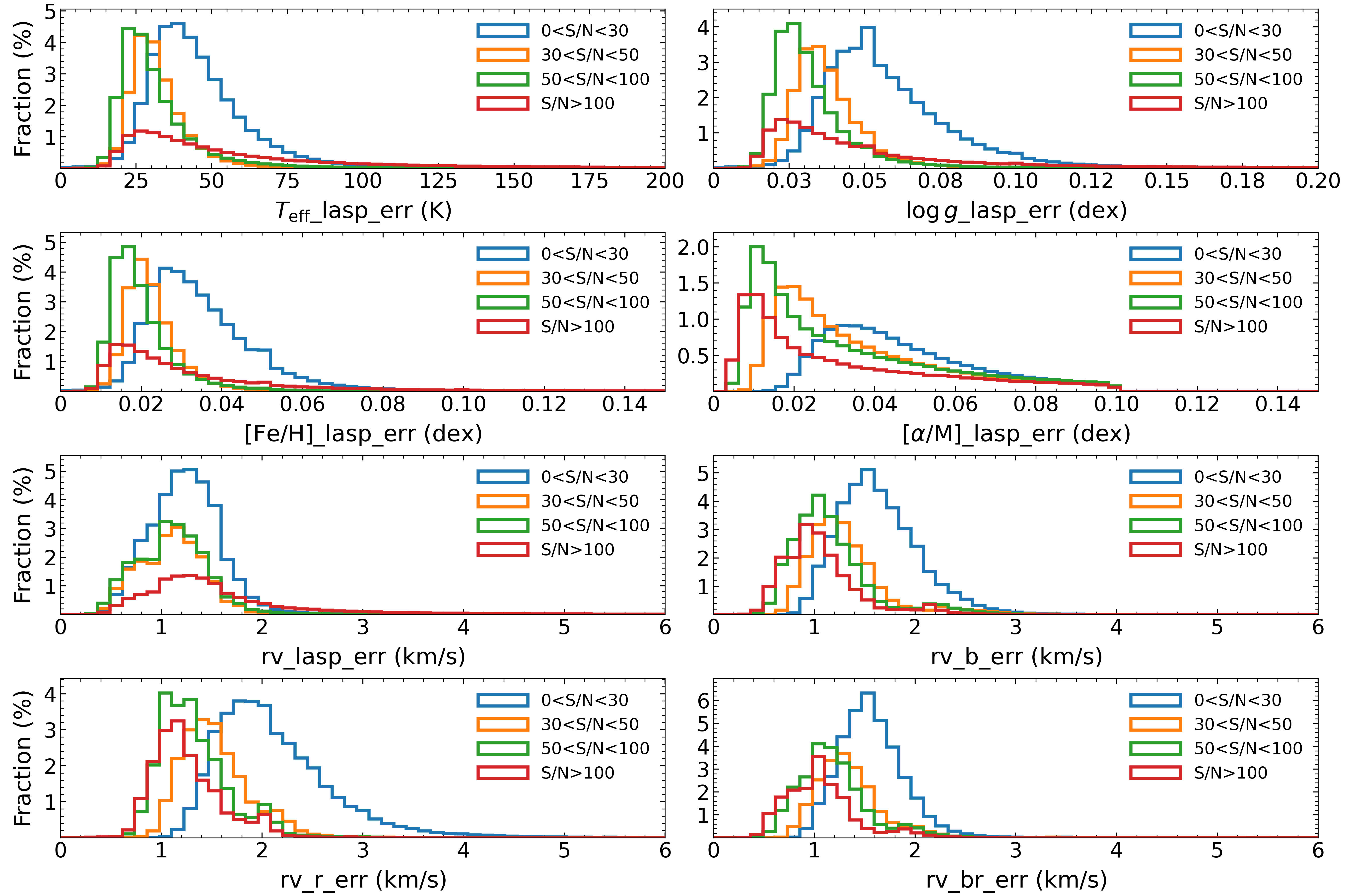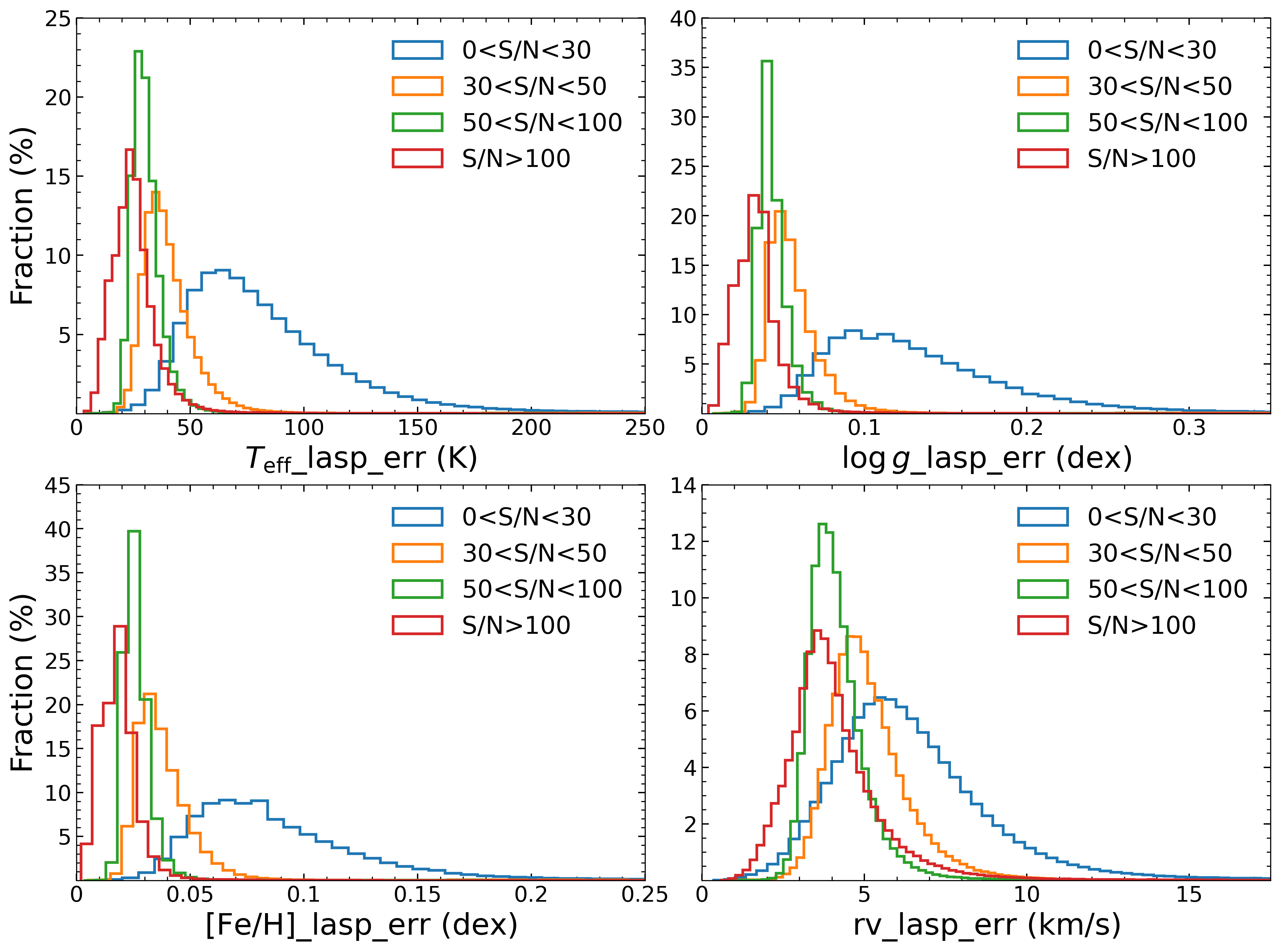 Distributions of LASP-reported uncertainties for effective temperature (Teff), surface gravity (log g), metallicity ([Fe/H]), and radial velocity (rv) in LAMOST DR11 v2.0 low-resolution spectra, grouped by r-band S/N bins. The y-axis of the figure below represents the percentage of spectra in each bin relative to the total number of spectra in each subplot. The y-axis meaning of subsequent histograms is the same as here.