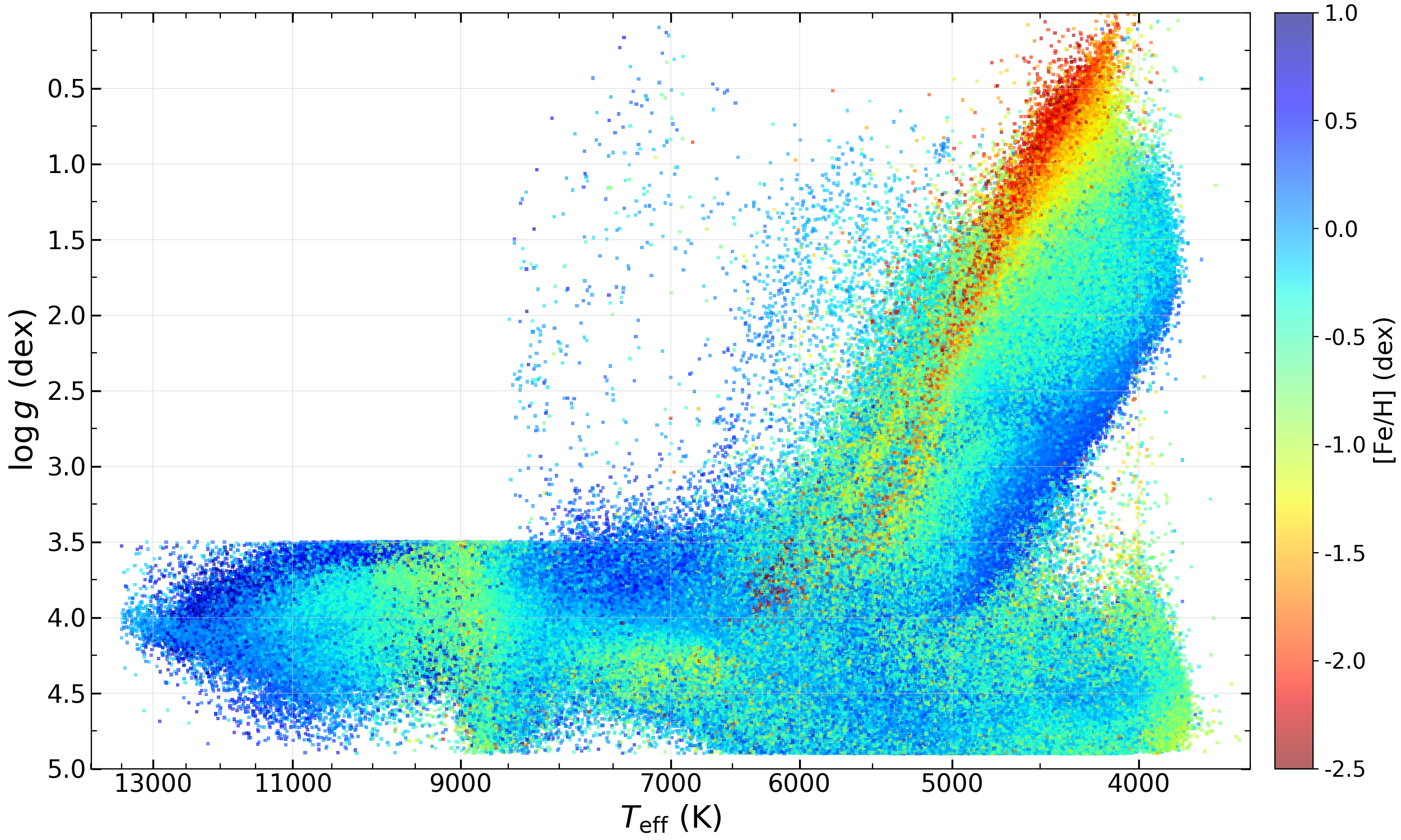 We also provide an additional set of stellar parameters, including Teff, log g, [M/H], and [α/M], derived using a convolutional neural network (CNN) approach. The corresponding Teff–log g diagram and [M/H]–[α/M] diagram for the combined spectra of DR11 v2.0 are presented below.