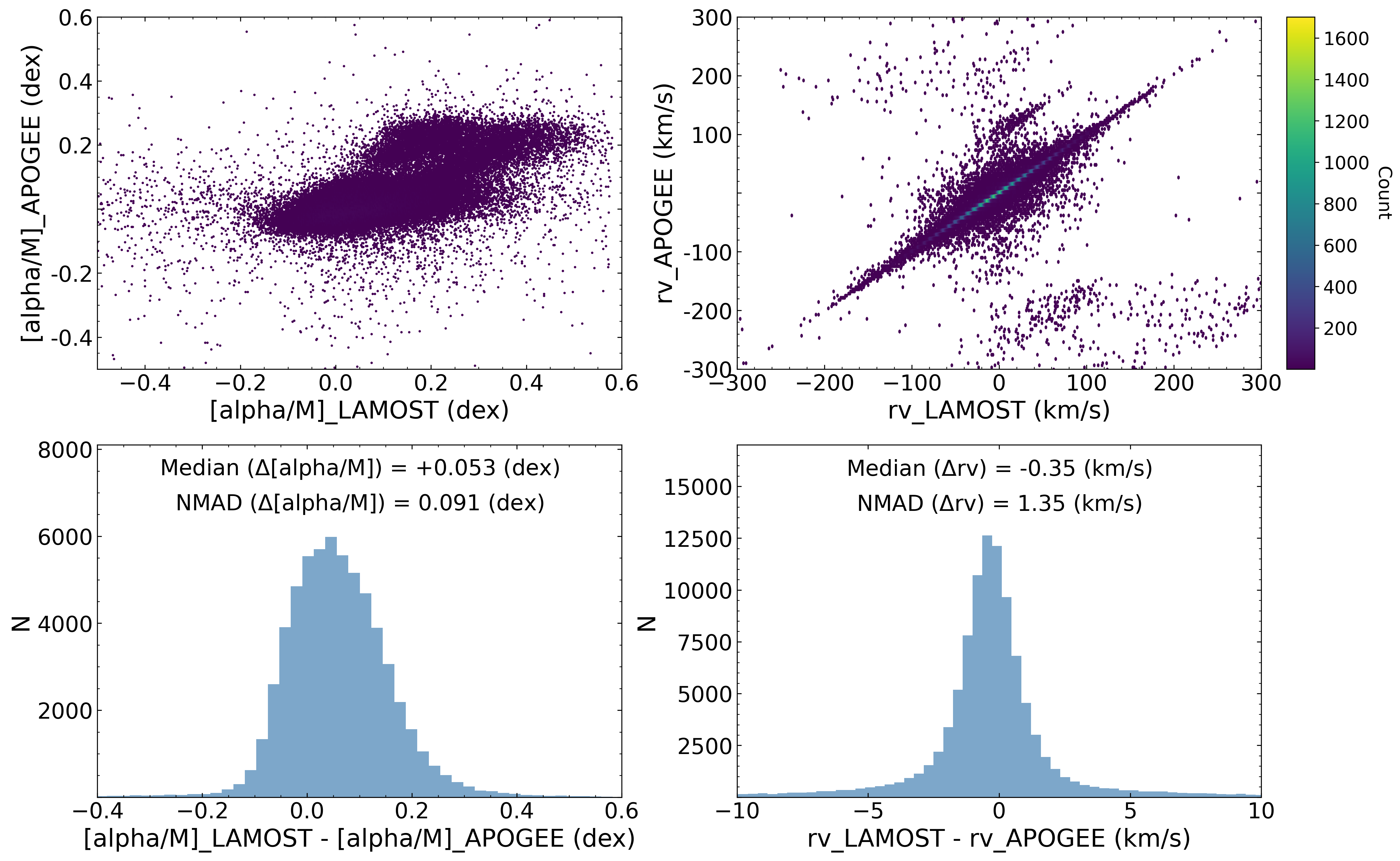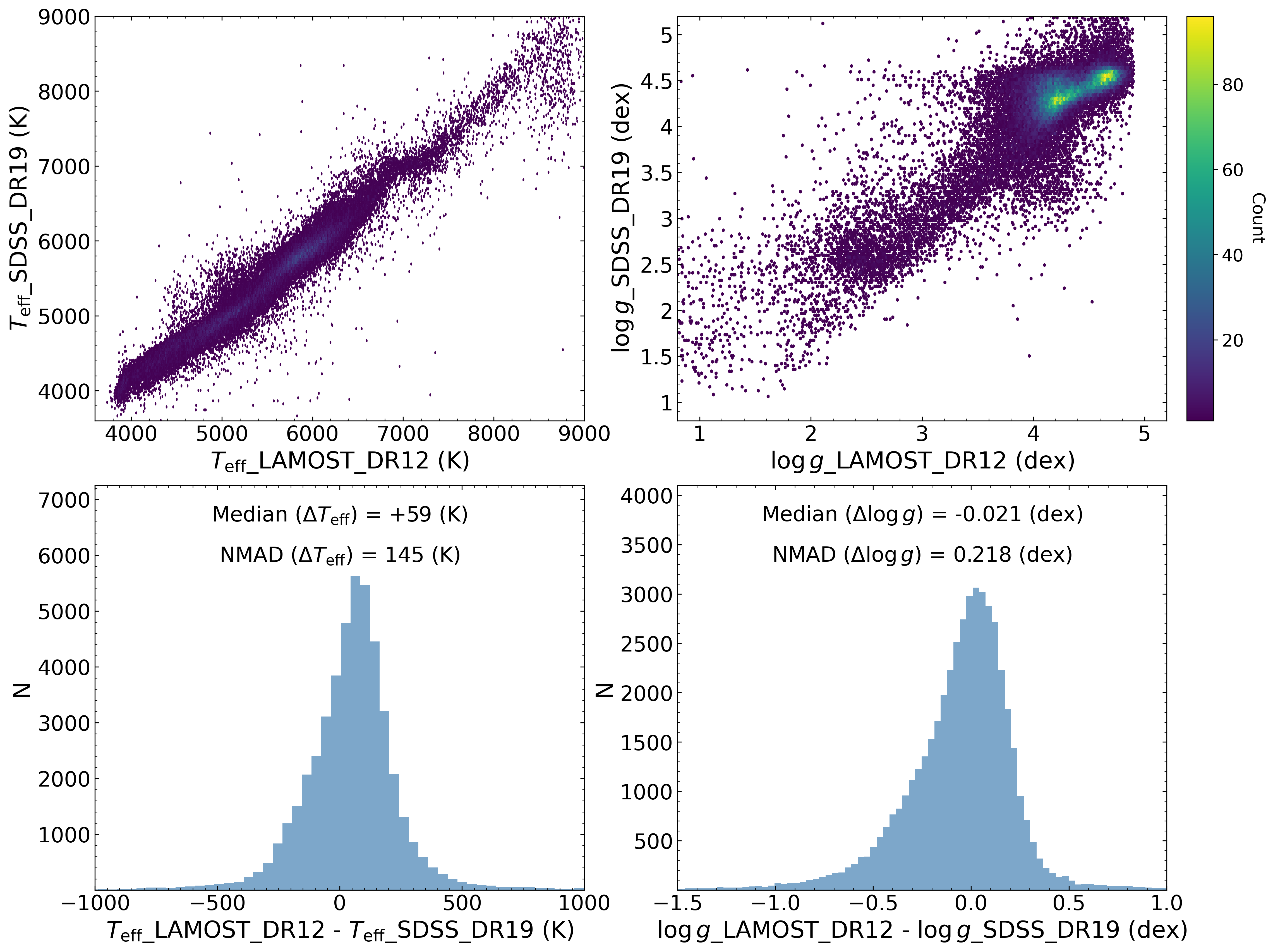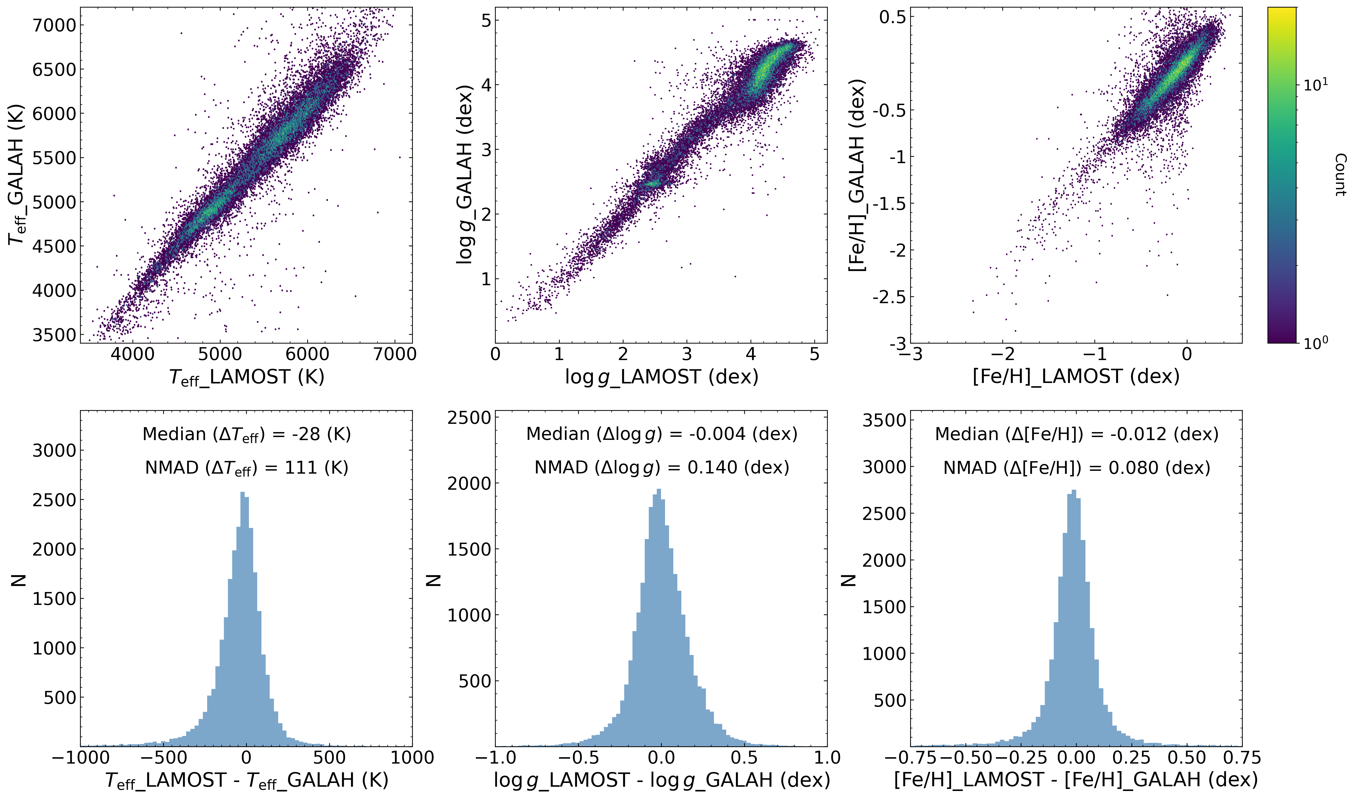 In the following sections, we compare stellar parameters from LAMOST low- and medium-resolution spectra with those from SDSS DR19, APOGEE DR19, and GALAH DR4 to validate the reliability of LAMOST parameters. To provide a comprehensive overview of the LAMOST data, we have not applied any quality cuts to either LAMOST or the comparison survey data, presenting parameter comparisons for all common sources. It should be noted that null values and invalid values (such as -9999) have been filtered out from all parameters, and a very small number of outliers may exist beyond the displayed ranges in the figures. Furthermore, the distributions of parameter differences between LAMOST and other surveys may or may not follow normal distributions. Therefore, instead of using mean and standard deviation to characterize the difference distributions, we employ two more robust statistics applicable to both normal and non-normal distributions: the median of the differences ("median"), which measures systematic offsets between parameters from the two surveys, and the Normalized Median Absolute Deviation ("NMAD"), which quantifies the scatter. These two statistics are annotated on each difference distribution plot presented below.