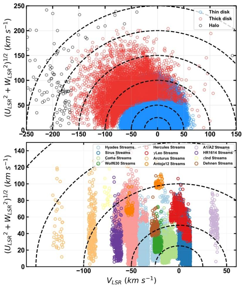 图1:不同银河系组分的恒星的Toomre图,上图包含了薄盘、厚盘和银晕,下图包含了12种星流。