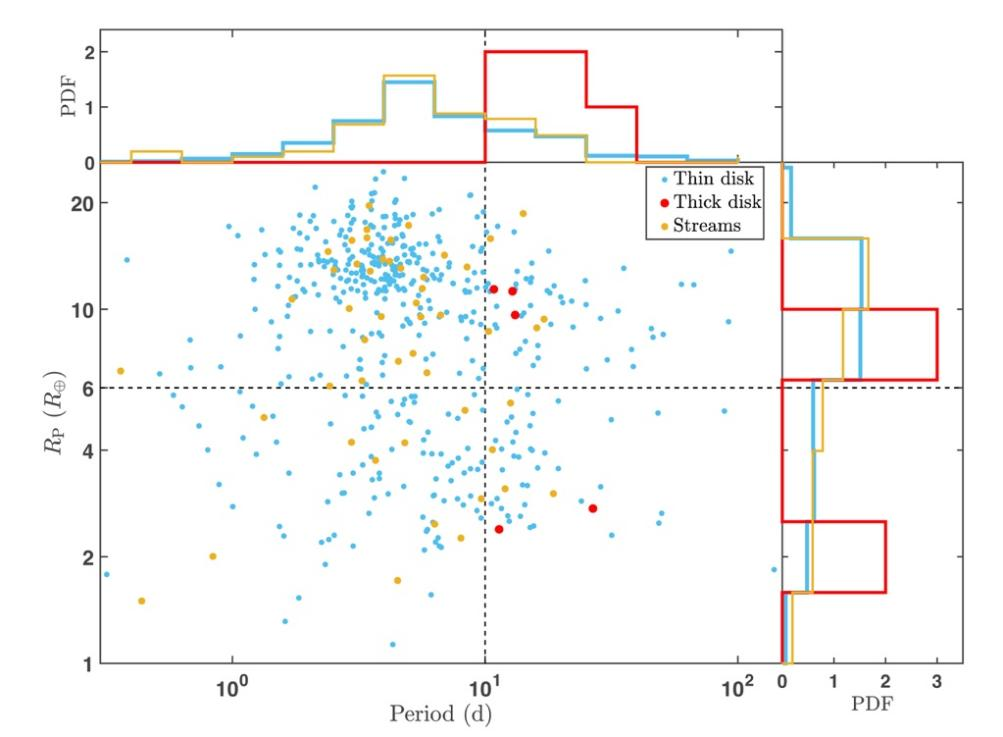 图2:TESS行星候选体的周期-半径分布。不同颜色代表其宿主恒星所属的银河系成分(蓝:薄盘;红:厚盘;黄:星流)。