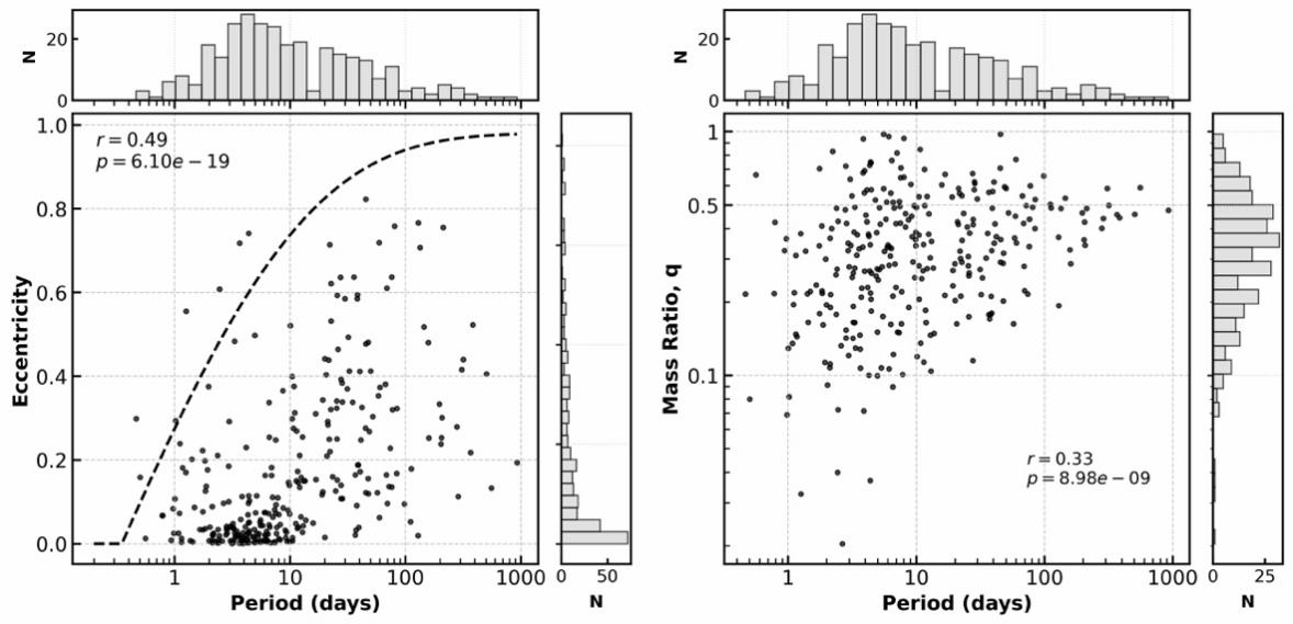 图3:轨道拟合较好的双星样本的偏心率-周期分布(左)和质量比-周期分布(右)。