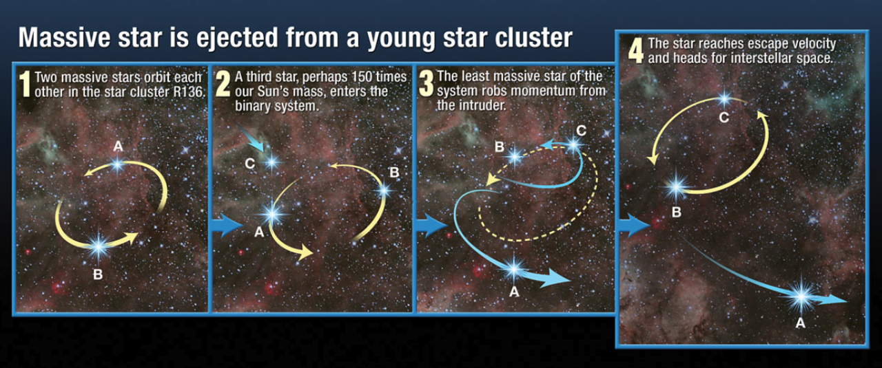 图二:速逃星的动力学弹射途径(https://esahubble.org/images/heic1008d/)